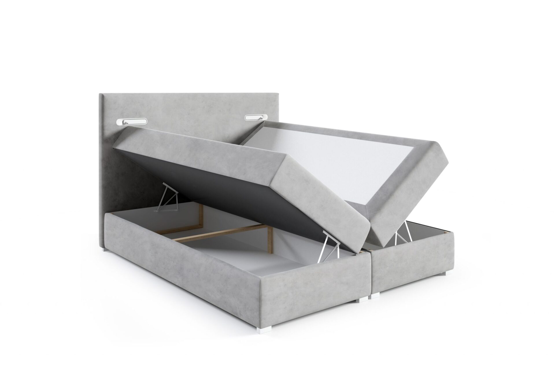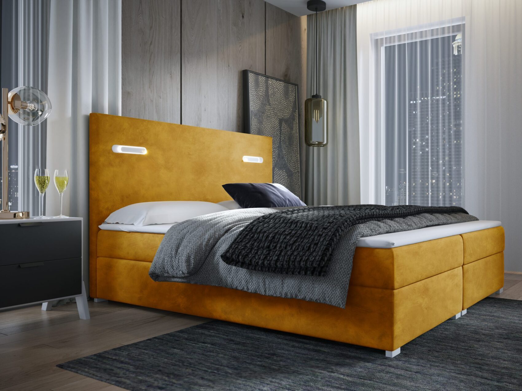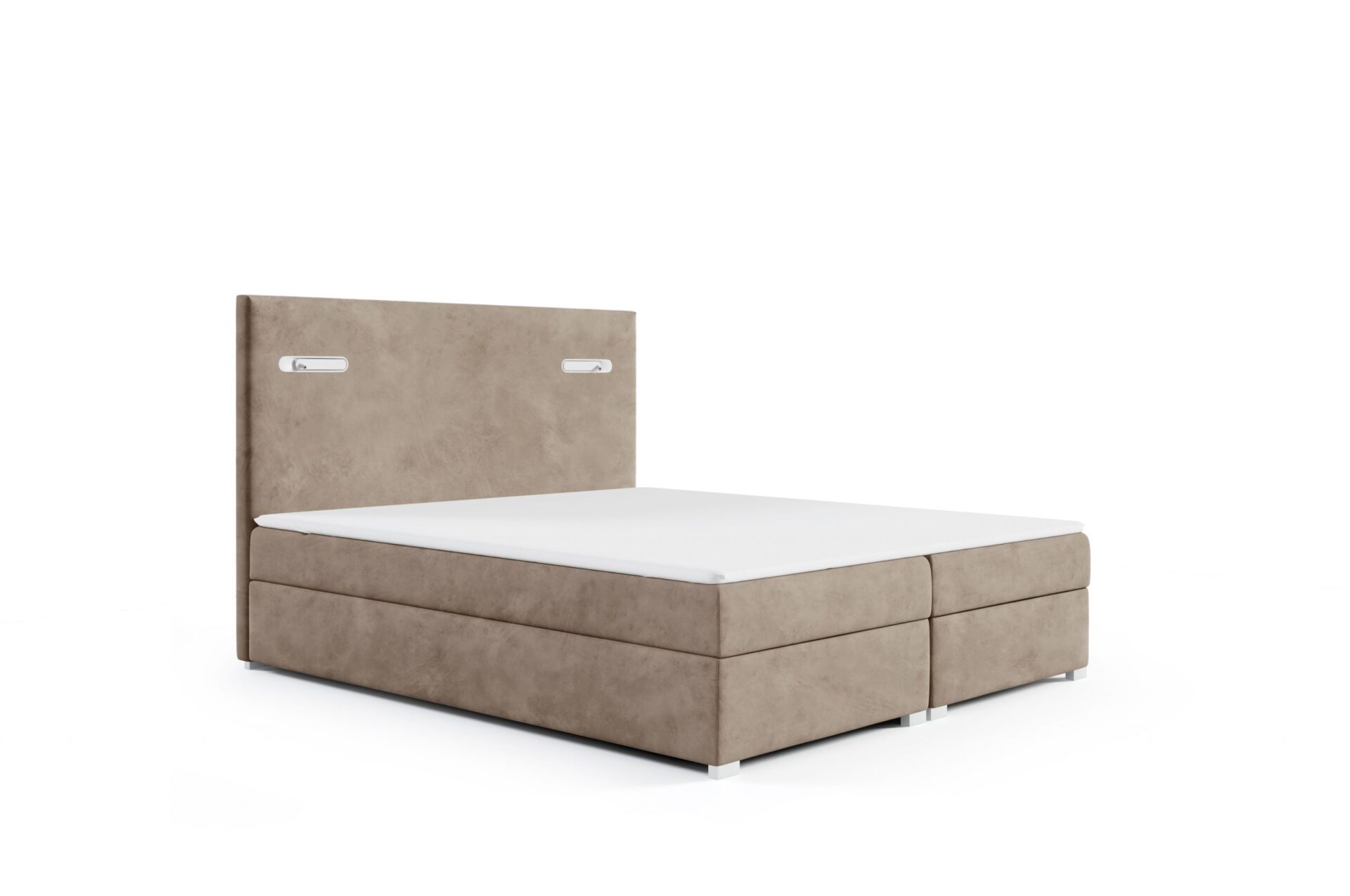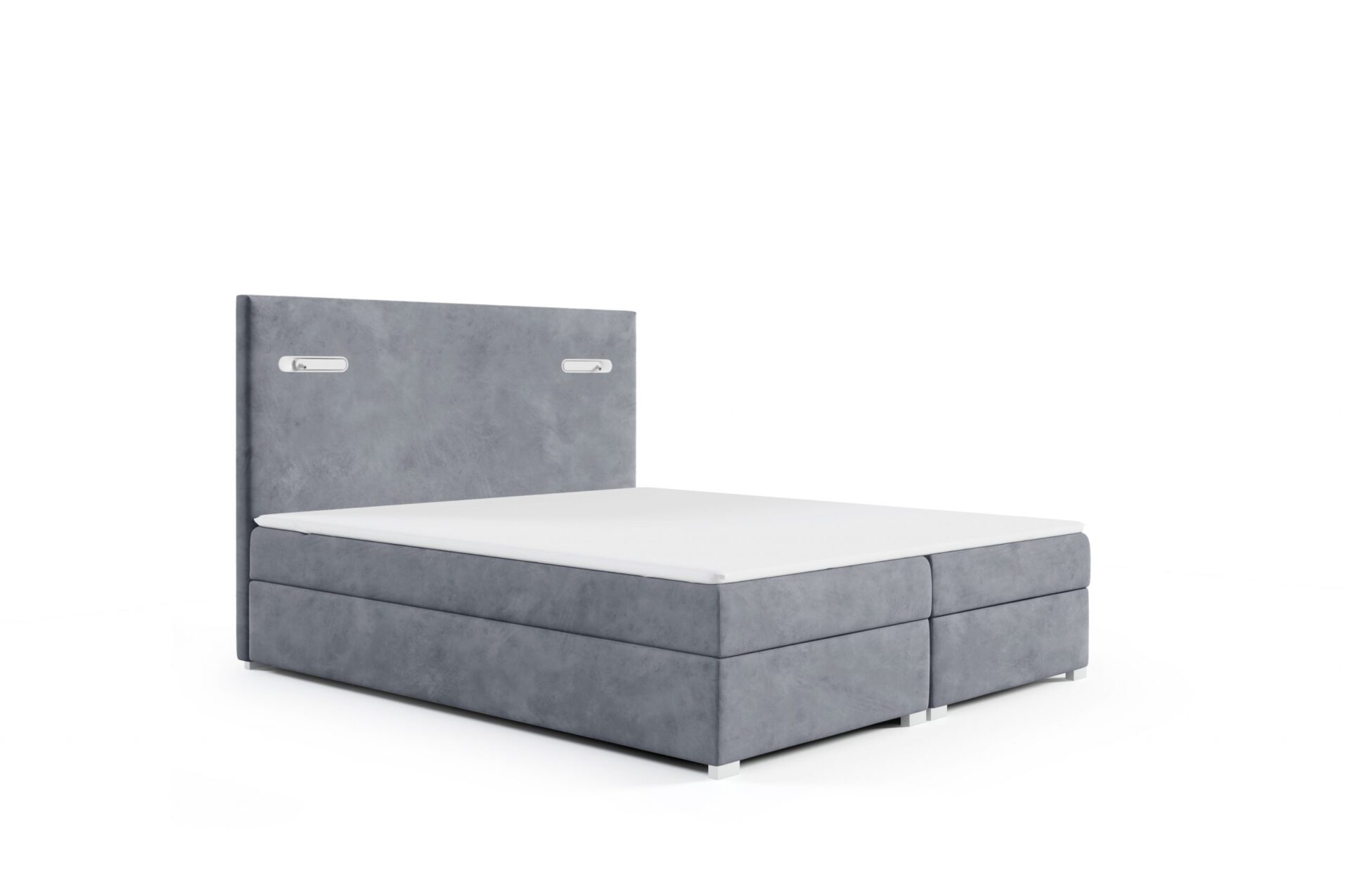 Kontinentales Bett ANTOS wird die moderne Komposition in Ihrem Schlafzimmer perfekt ergänzen. Dieses Bett mit einem hohen und weichen Kopfteil ist mit zwei LED-Lampen ausgestattet, die einen einzigartigen Stil zu jedem Interieur hinzufügen wird. Darüber hinaus sind sie ideal für Liebhaber der Lektüre von Büchern, sondern auch, zum Beispiel, für die Abendarbeit mit einem Laptop. Die Lampen werden durch Berührung aktiviert und funktionieren in zwei Versionen: diffuses Licht oder Spotbeleuchtung auf einem schwenkbaren Lager, das es Ihnen ermöglicht, den Lichtstrahl dorthin zu lenken, wo Sie ihn brauchen. Das Bett hat eine sehr hochwertige Matratze mit Bonellfedern als Standard.