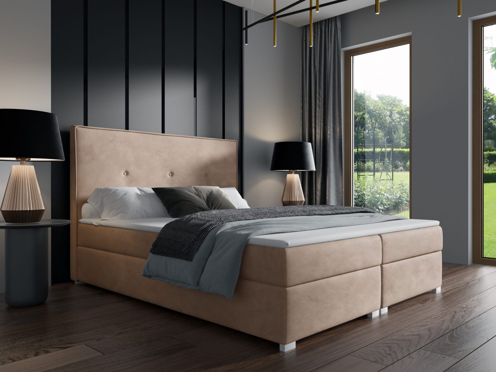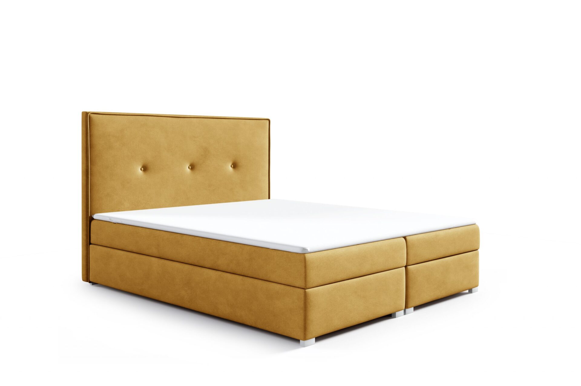 Kontinentales Bett LETTY ist ein elegantes und einzigartiges Bett, das jedes Schlafzimmer zu einem besonderen Ort macht. Die auffälligen Nähte, die den Rahmen des Kopfteils bilden, und die drei aufgenähten Knöpfe in der Farbe der Polsterung verleihen der gesamten Komposition einen Hauch von Raffinesse. Das Bett wird serienmäßig mit einer hochwertigen Matratze mit Bonellfedern sowie zwei Bettzeugbehältern geliefert.