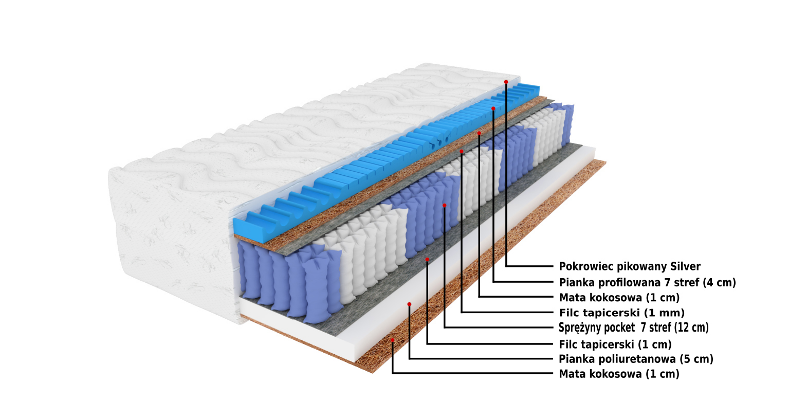 Polstermaterial 1 mm – naturalna przekładka, która oddziela warstwę sprężyn od warstwy pianki. Naturalny filc może znacznie wydłużyć żywotność materaca, wzmacnia też jego konstrukcję. Zaletą filcu jest również duża elastyczność oraz przyleganie do danej powierzchni Stosowana jest między sprężynami kieszeniowymi a kolejną warstwą. Jest to bardzo ważny , wzmacniający element materaca.