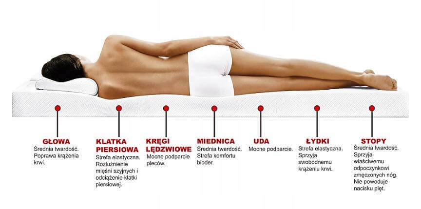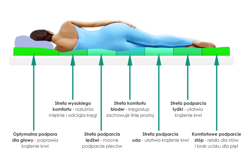 ZELLENFEDERN 12 cm – Sprężyny dzielą materac na 7 stref, każda o odpowiednim podparciu dla danej części ciała. Z profilowaną pianką która jest użyta jako wierzchnia warstwa materaca, użyte w materacu strefowe sprężyny kieszeniowe dają jeszcze większy komfort snu. Sprężyny pracują niezależnie od siebie, dzięki czemu dwie osoby śpiące koło siebie nie odczuwają dyskomfortu z powodu wiercenia się drugiej osoby. Materac jest również znakomity dla osób o różnej wadze ciała, ponieważ dzięki sprężynach kieszeniowych materac nie ugina się w stronę drugiej osoby.