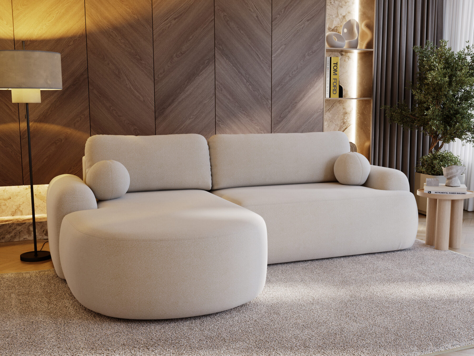 Eckeinheit CORTADO ist eine Kombination aus Eleganz, Funktionalität und gemütlichem Design. Seine abgerundeten Formen verleihen dem Interieur eine weiche und moderne Note, während sein außergewöhnlicher Komfort ihn schnell zu einem beliebten Ruheplatz in Ihrem Zuhause werden lässt. Ausgestattet mit einer Schlaffunktion, lässt es sich leicht in ein bequemes Bett für Gäste oder für den täglichen Gebrauch verwandeln. Ein in der Eckkonstruktion versteckter Bettzeugkasten bietet praktischen Stauraum und sorgt für Ordnung im Wohnzimmer. Eine weitere Besonderheit sind die runden Kissen in der Farbe der Ecke, die nicht nur die runde Form des Möbels unterstreichen, sondern auch für zusätzlichen Halt und Komfort sorgen. CORTADO ist in verschiedenen Farben erhältlich, so dass Sie es problemlos an den Stil Ihrer Einrichtung anpassen können - von gedeckten Beige- und Grautönen bis hin zu markanten, trendigen Akzenten. Das Ecksofa ist aus hochwertigem Lambi-Stoff (Qualität: Boucle) gefertigt, der sehr abriebfest ist und sich zudem sehr angenehm anfühlt.