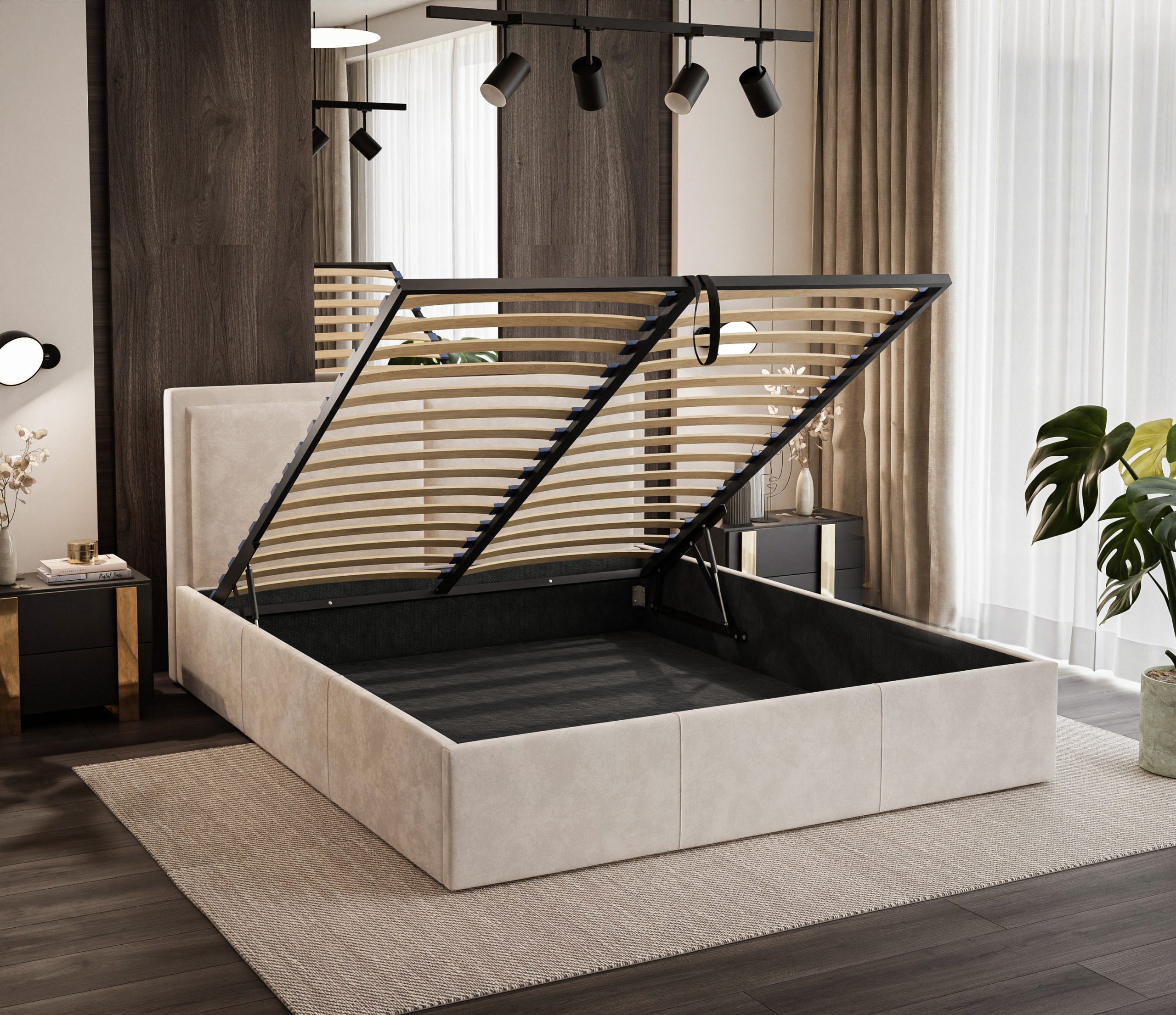 Bedding container with wood frame and elastic slats made of birch wood. Spring lifts assist in opening the container and keep it in a raised position.