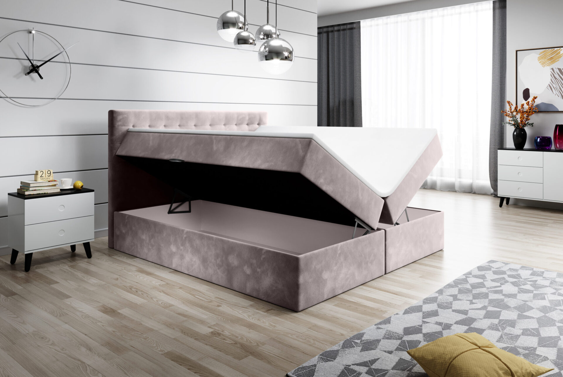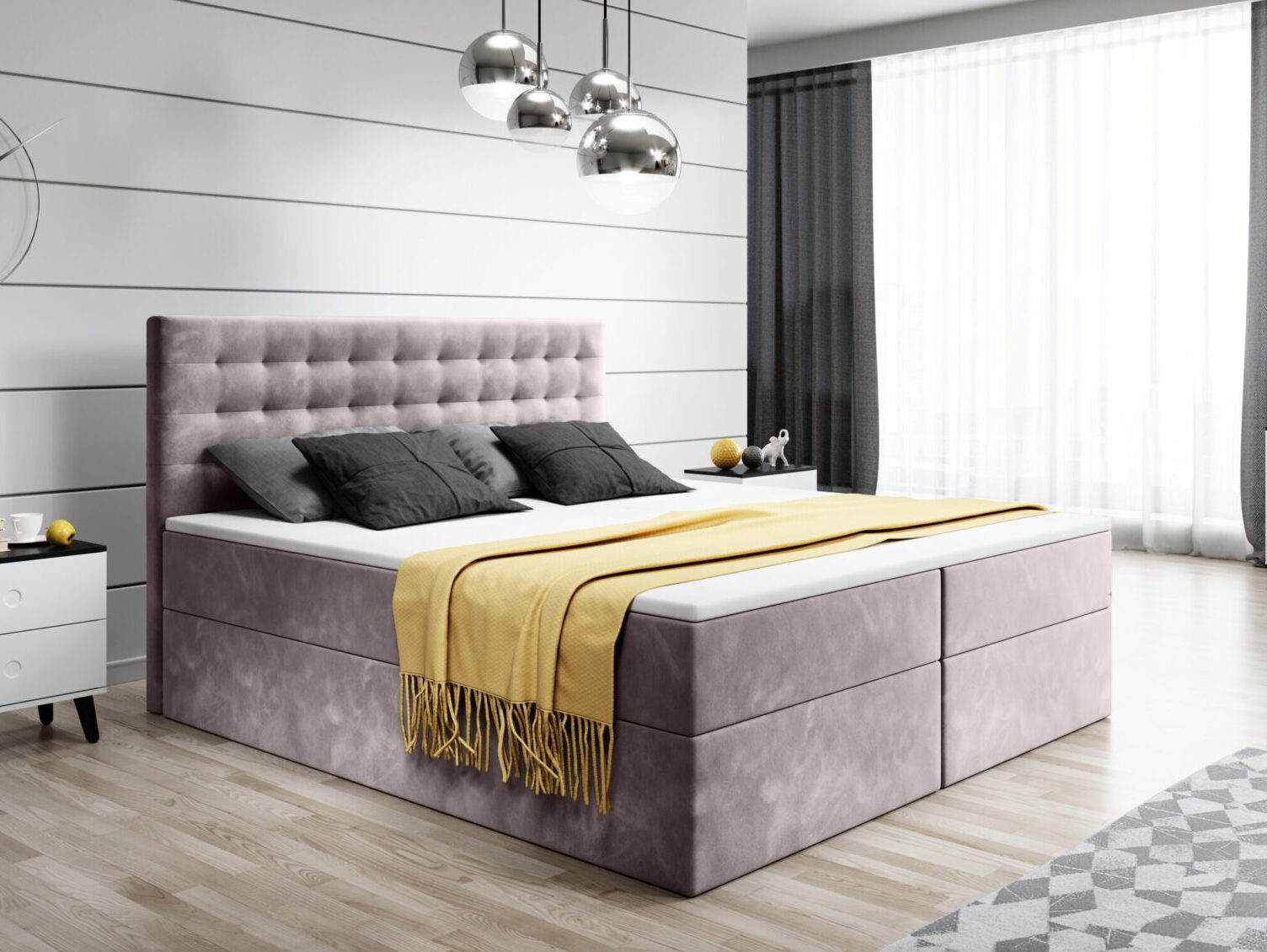 Continental bed BARRY is a combination of design, perfection and comfort. The high-end bed is an ideal choice for everyone. Designed and manufactured with the utmost attention to detail. The bed attracts attention and delights with its unusual design, in which the main role is played by the charming headrest. Barry was made of high quality materials. The bed comes standard with a mattress with bonell springs of very high quality.