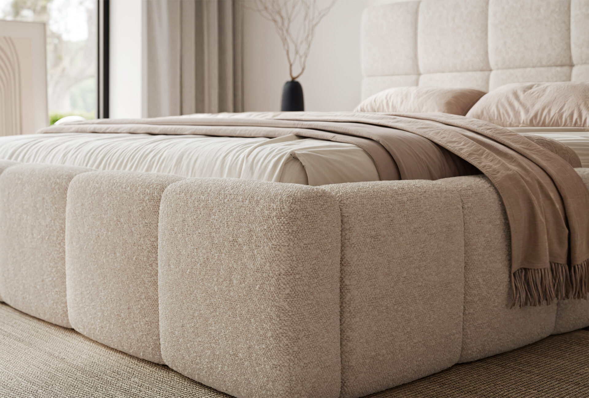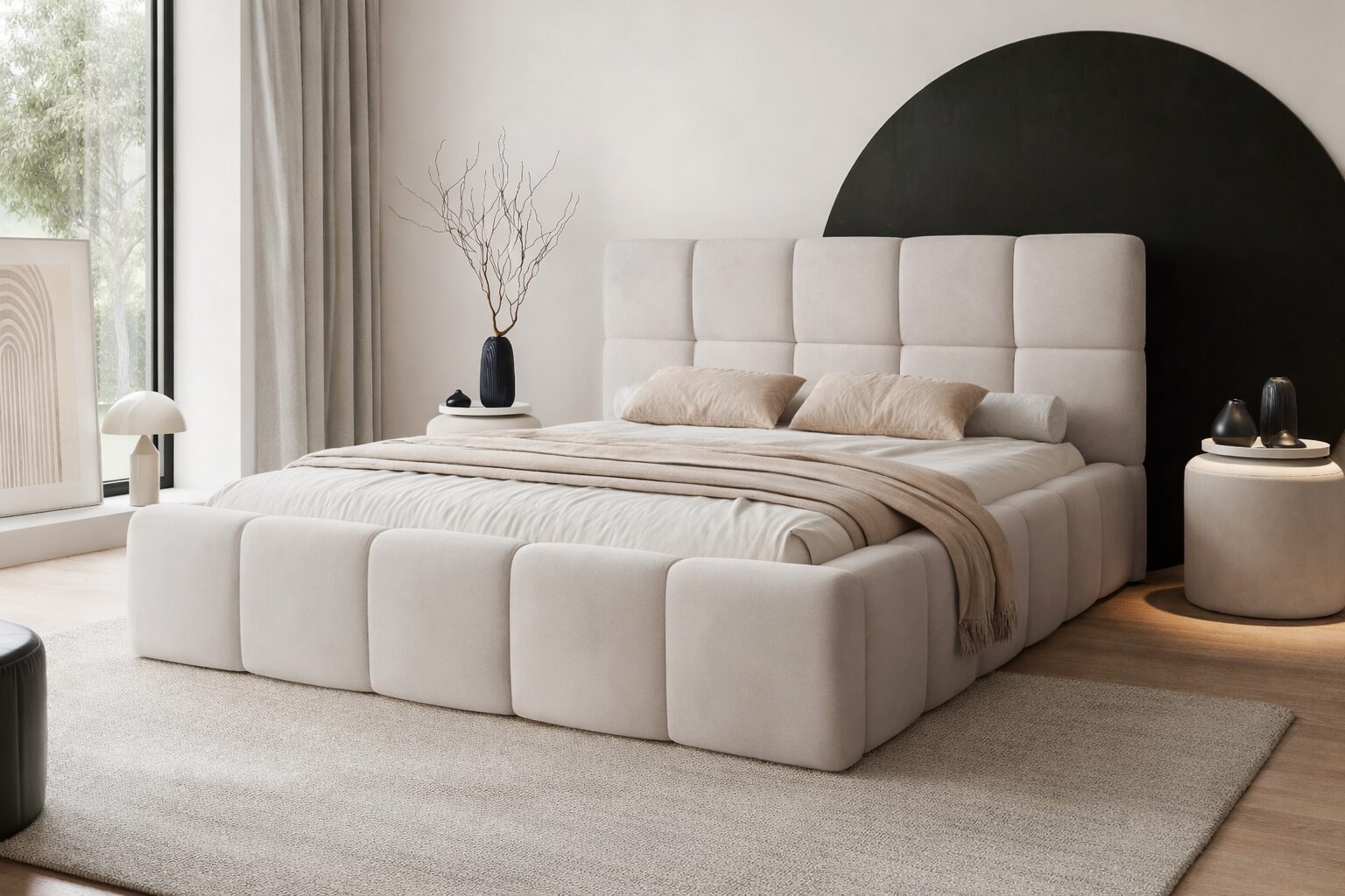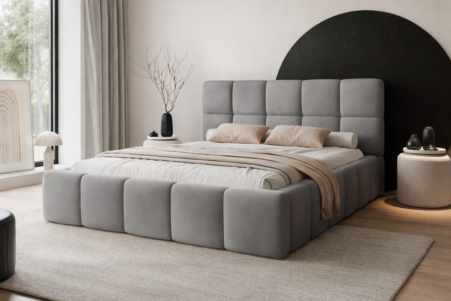 Łóżko tapicerowane FIRENZE wyróżnia się nowoczesną, masywną bryłą oraz eleganckim wezgłowiem z geometrycznym podziałem. Harmonijne proporcje i miękkie linie nadają mu wyrazisty, a jednocześnie przytulny charakter, który doskonale wpisuję się w aktualne trendy wnętrzarskie.