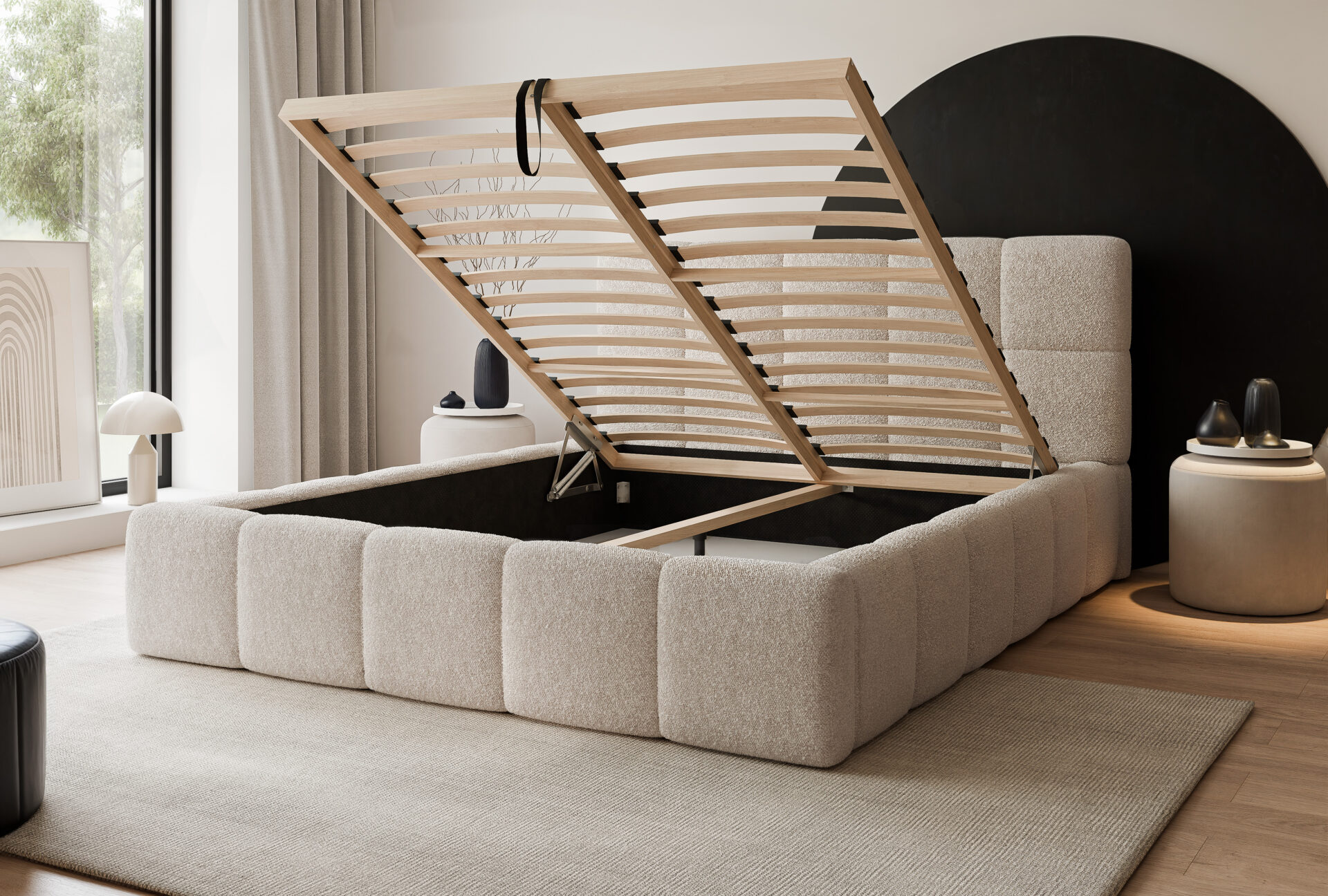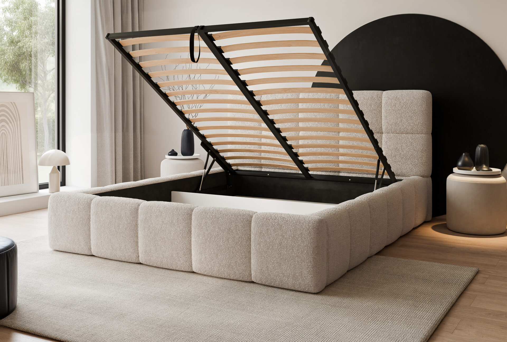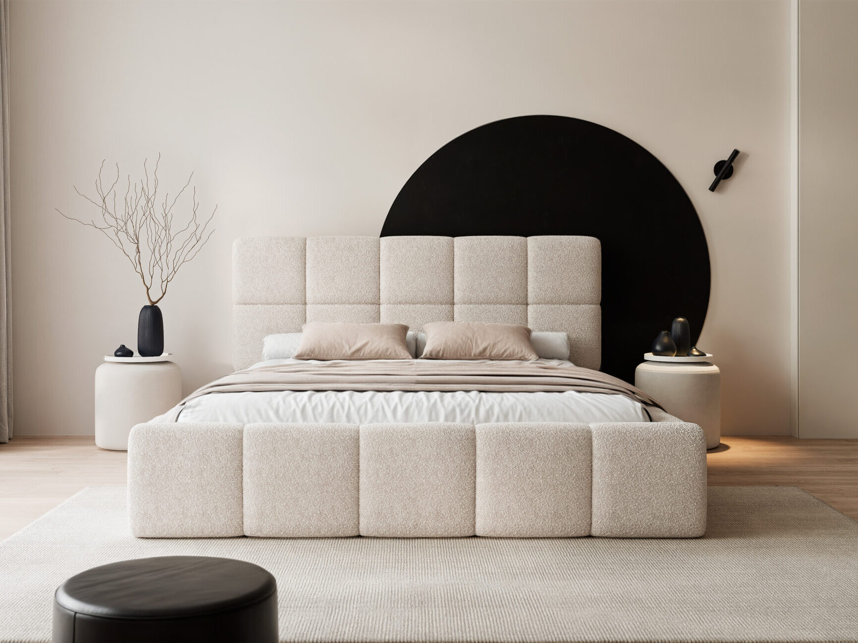 Łóżko tapicerowane FIRENZE wyróżnia się nowoczesną, masywną bryłą oraz eleganckim wezgłowiem z geometrycznym podziałem. Harmonijne proporcje i miękkie linie nadają mu wyrazisty, a jednocześnie przytulny charakter, który doskonale wpisuję się w aktualne trendy wnętrzarskie.