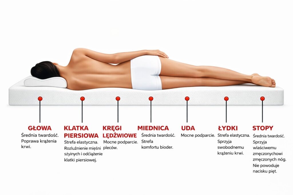 SPRĘŻYNY KIESZENIOWE 12 cm – Sprężyny dzielą materac na 7 stref, każda o odpowiednim podparciu dla danej części ciała. Z profilowaną pianką która jest użyta jako wierzchnia warstwa materaca, użyte w materacu strefowe sprężyny kieszeniowe dają jeszcze większy komfort snu. Sprężyny pracują niezależnie od siebie, dzięki czemu dwie osoby śpiące koło siebie nie odczuwają dyskomfortu z powodu wiercenia się drugiej osoby. Materac jest również znakomity dla osób o różnej wadze ciała, ponieważ dzięki sprężynach kieszeniowych materac nie ugina się w stronę drugiej osoby.